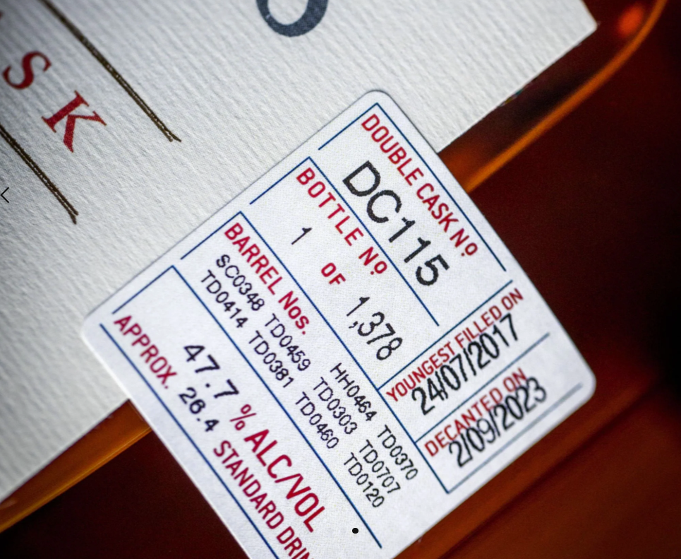 Double Cask DC115’s youngest cask was aged 6 years, and its oldest cask was aged 17 years. Maturing in a combination of French and American oak, DC115 was bottled at 46% and yielded 1,115 bottles.